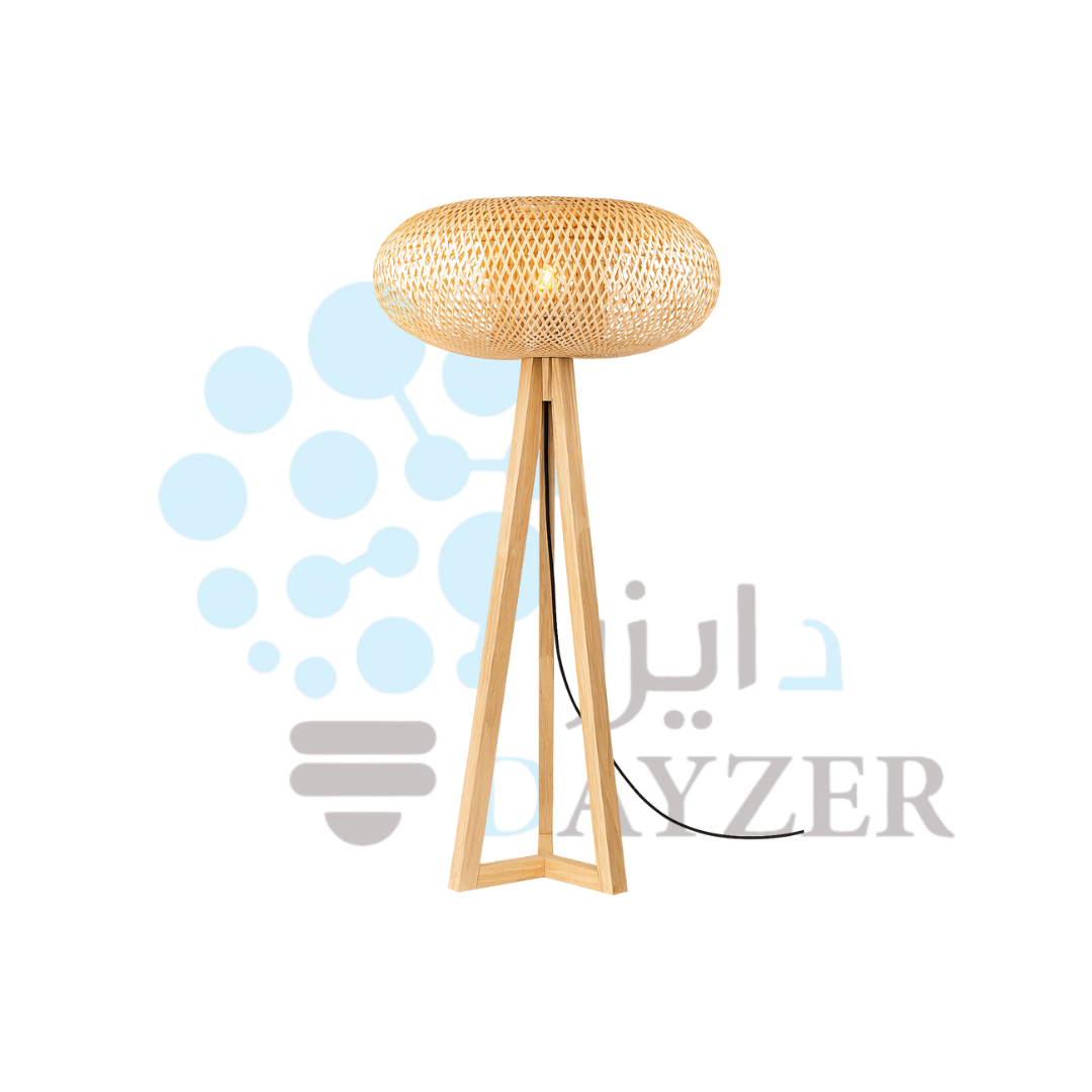 أباجورة أرضية بتصميم هندسي أنيق ولمسة طبيعية، تجمع بين قاعدة مثلثة مصنوعة من الخشب الصلب، وغطاء خيزراني عريض بنمط مفرغ ينشر الإضاءة بشكل شاعري ومريح للعين.