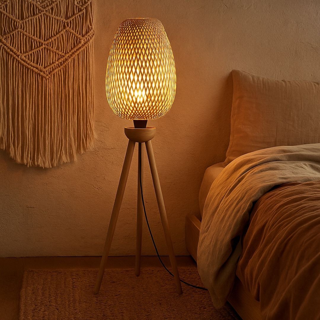 أباجورة أرضية أنيقة بقاعدة ثلاثية من الخشب الطبيعي، تتزين بغطاء خيزراني شبكي بنقشة مفرغة على شكل قطرة، مما يمنحها طابعًا بوهيميًا ساحرًا وإضاءة دافئة تنساب بين الثقوب بأسلوب شاعري.