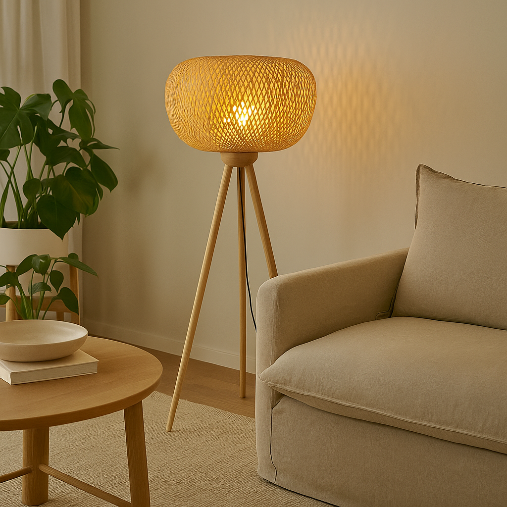 تصميم أنيق وفريد يجمع بين البساطة والطبيعة، بغطاء خيزراني واسع ذو نمط شبكي ناعم ينثر الضوء بطريقة فنية. ترتكز على قاعدة ثلاثية من الخشب الطبيعي تضفي توازنًا وأناقة على المكان.