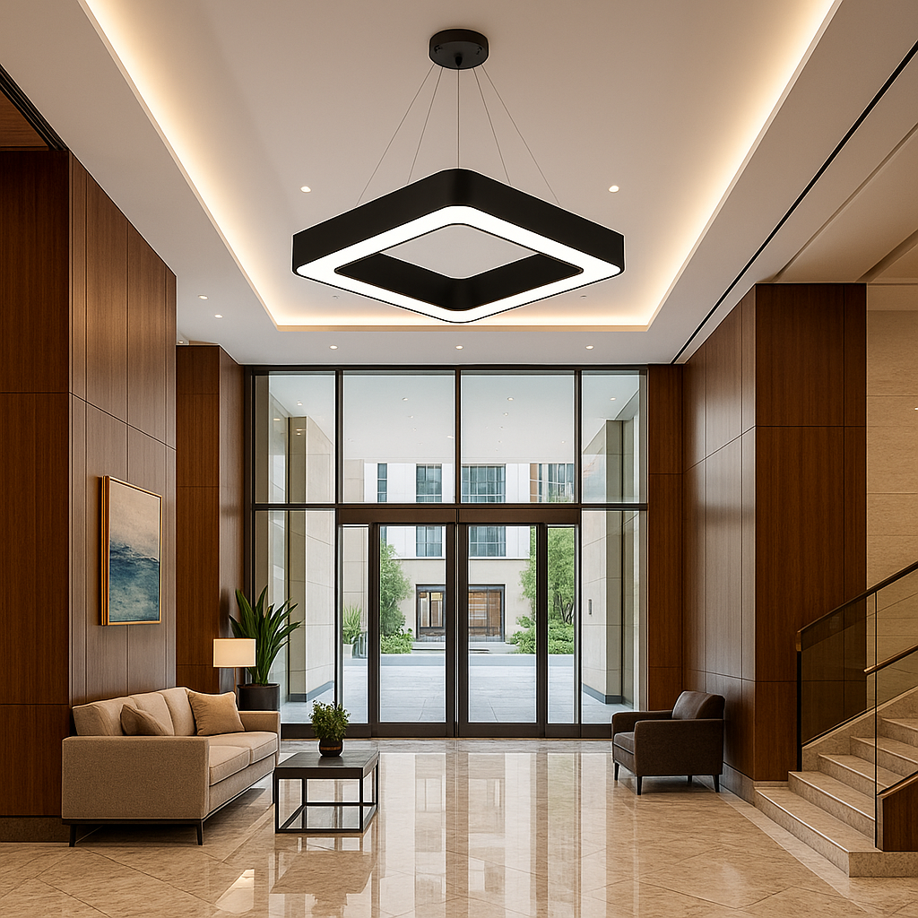 بانل إنارة معلّق بتصميم مربع أنيق بحجم 60 سم، بقدرة 45 واط. مصنوع من الألمنيوم عالي الجودة مع إطار أسود مطفي يمنح المكان لمسة عصرية راقية. مثالي لإنارة المكاتب والمساحات الإدارية بإضاءة ناعمة ومريحة.