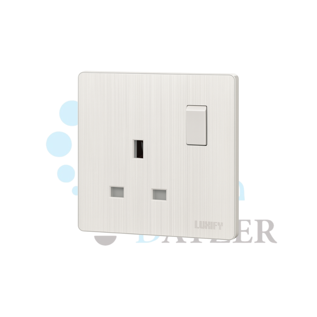 فيش كهرباء بقدرة 13 أمبير مدمج مع مفتاح تشغيل/إيقاف، بلون لؤلؤي أنيق من سلسلة LUXIFY. تصميم عصري وفاخر يتناغم مع جميع أنماط الديكور الداخلي، ويضفي لمسة جمالية راقية للجدران.
